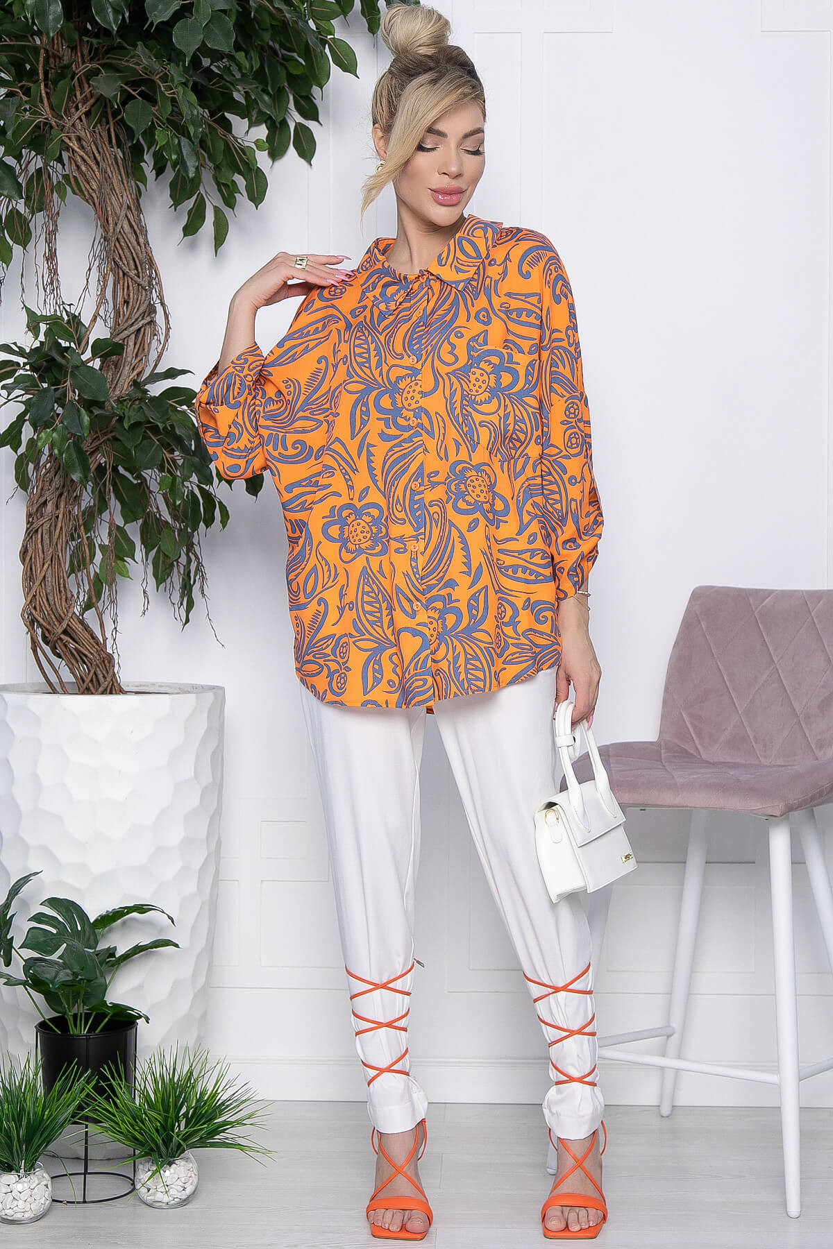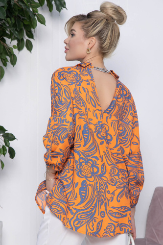 Лёгкая рубашка свободного кроя с акцентной спинкой. Классический отложной воротник по переду, по спинке украшен цепочкой серебряного цвета. Такая рубашка подойдёт для создания стильного летнего образа и будет гармонично смотреться в сочетаниях с джинсами, шортами и брюками.