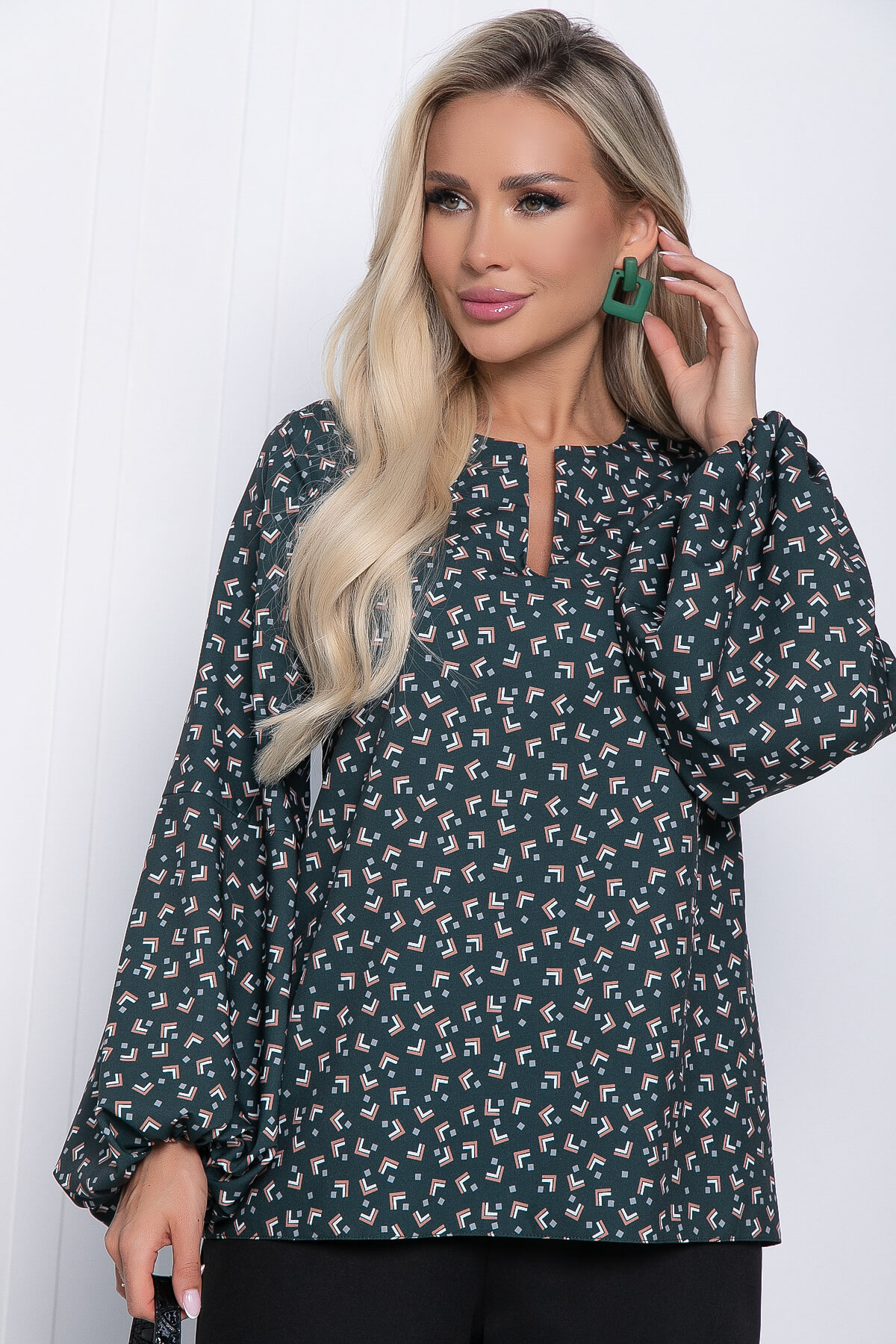 Блузка с геометрическим принтом - прекрасный выбор для стильных офисных образов! Отлично сочетается с юбками и брюками. Свободный крой позволяет с лёгкостью скрыть недостатки фигуры. Низ рукавов на резинке.