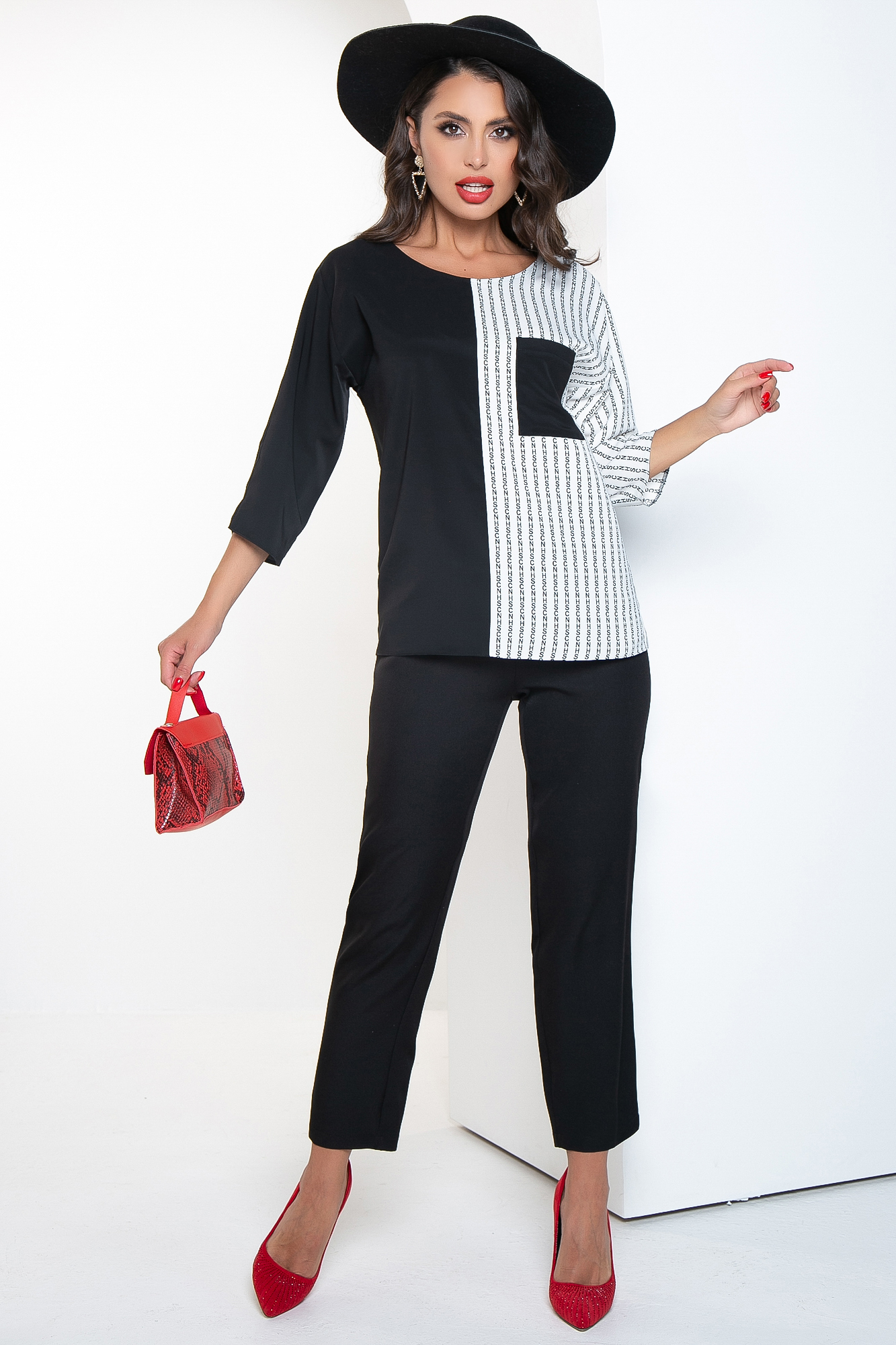 - Комбинированная блуза: одна часть выполнена из однотонной блузочной ткани чёрного цвета, вторая часть из ткани с дизайнерским принтом;
