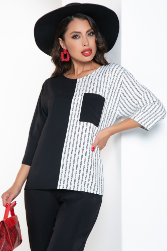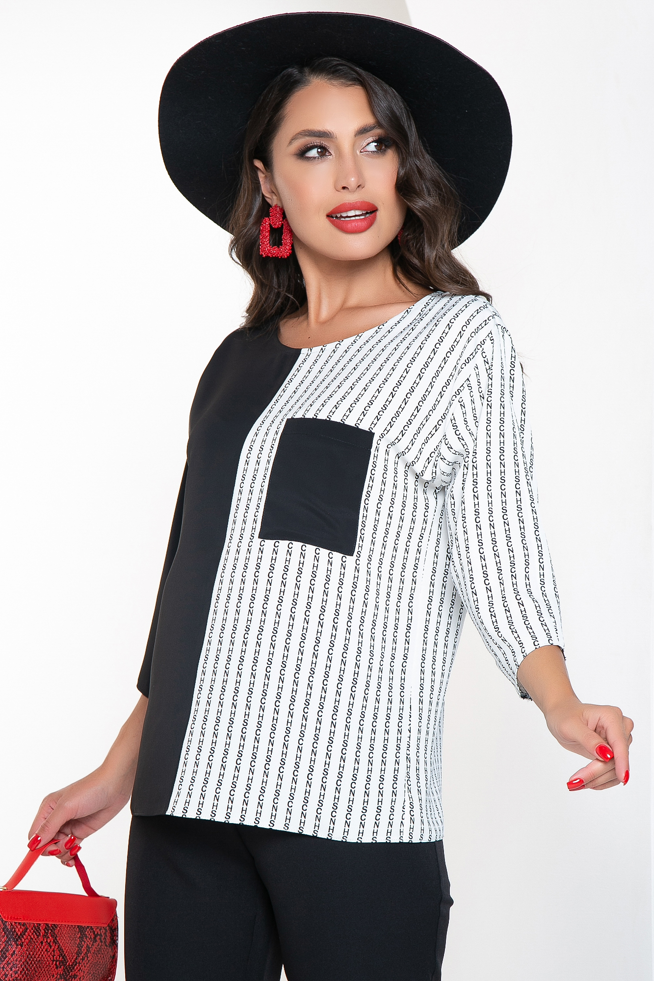 Дизайнерская блуза из комбинированной ткани, половина которой украшена буквенным принтом и карманом прекрасно впишется в Ваш офисный и осенний гардероб. Дополните образ яркими аксессуарами и губной помадой и ловите на себе восхищенные взгляды поклонников!