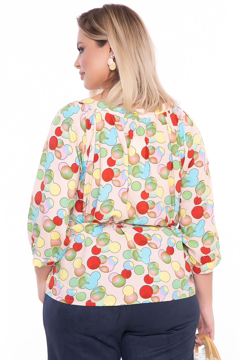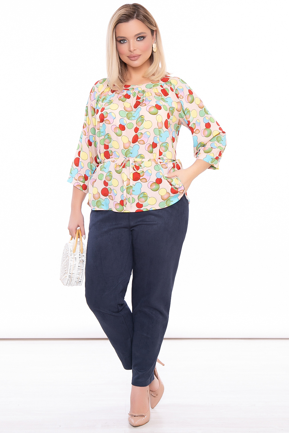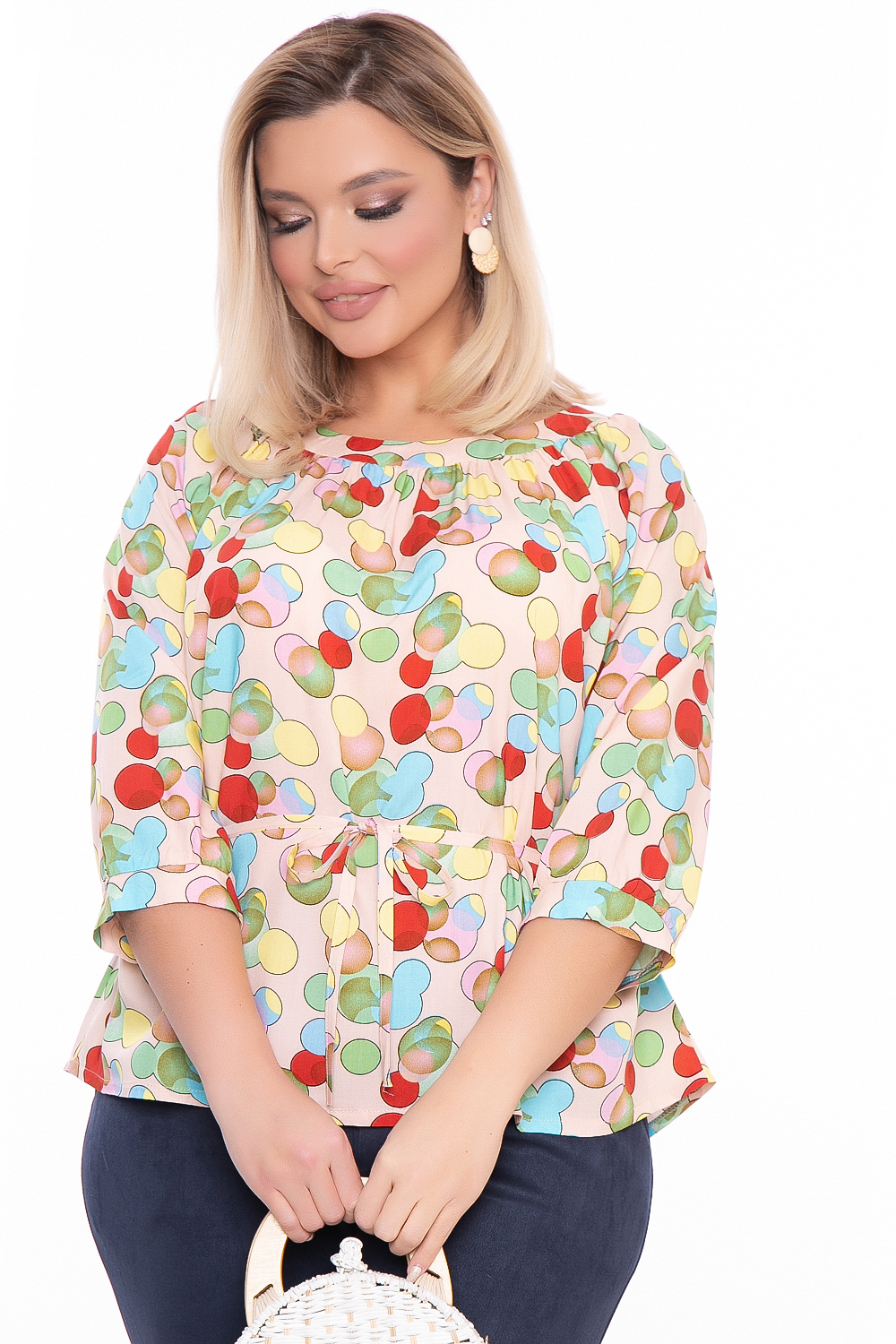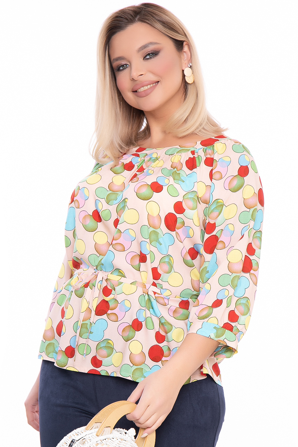 Очаровательная лёгкая блуза свободного кроя с завязками на талии. Округлый вырез горловины. Рукав втачной, три четверти, на манжете. Яркий принт - отличное решение для сезона весна-лето 2022!