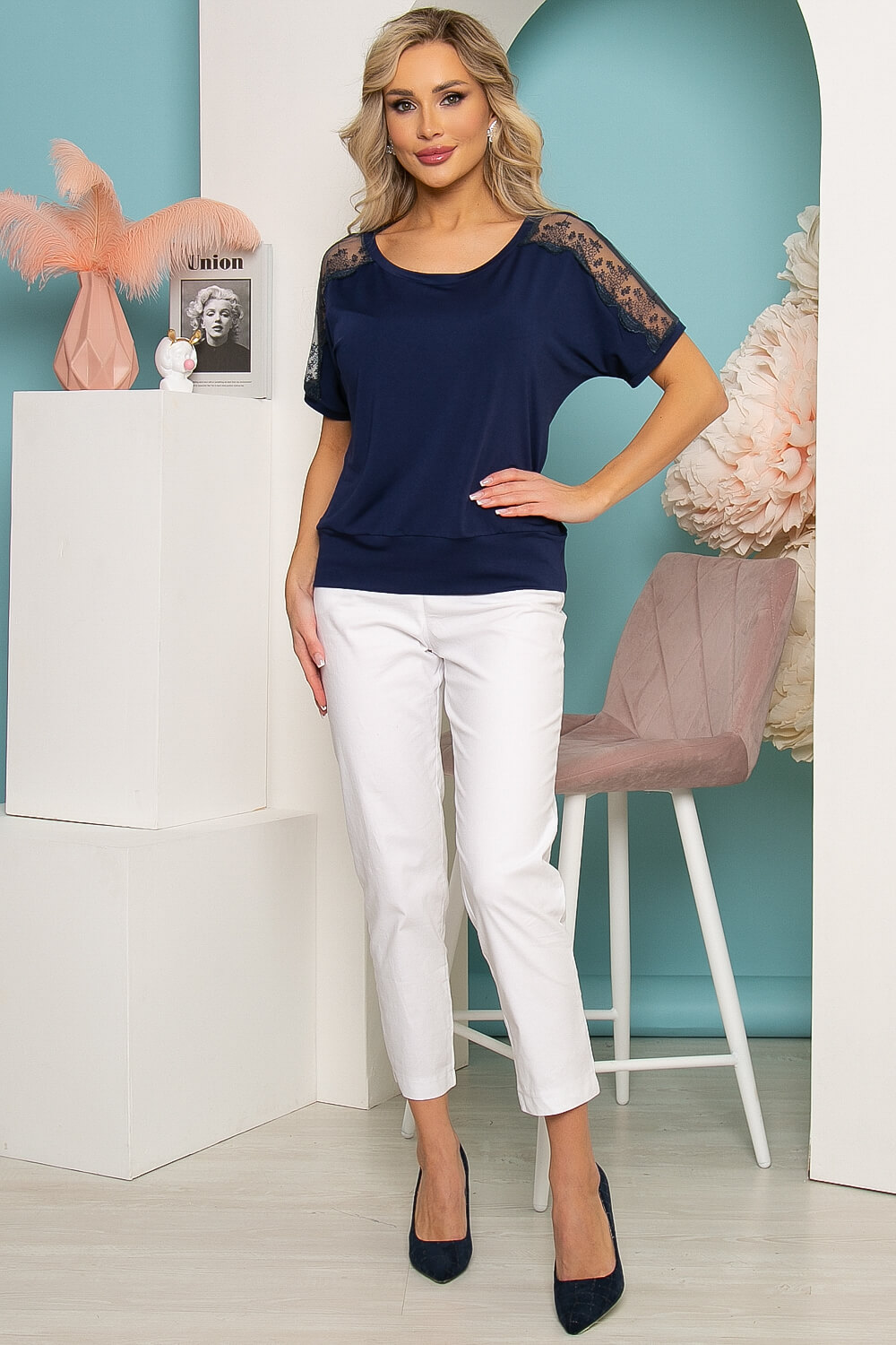 Элегантная блуза с коротким цельнокроеным рукавом украсит Ваш деловой или повседневный образ. Рукава декорированы вставками из тончайшего кружева, добавляющего образу женственности и загадочности. Блуза прямого кроя, вырез горловины - округлый, низ на притачном поясе.