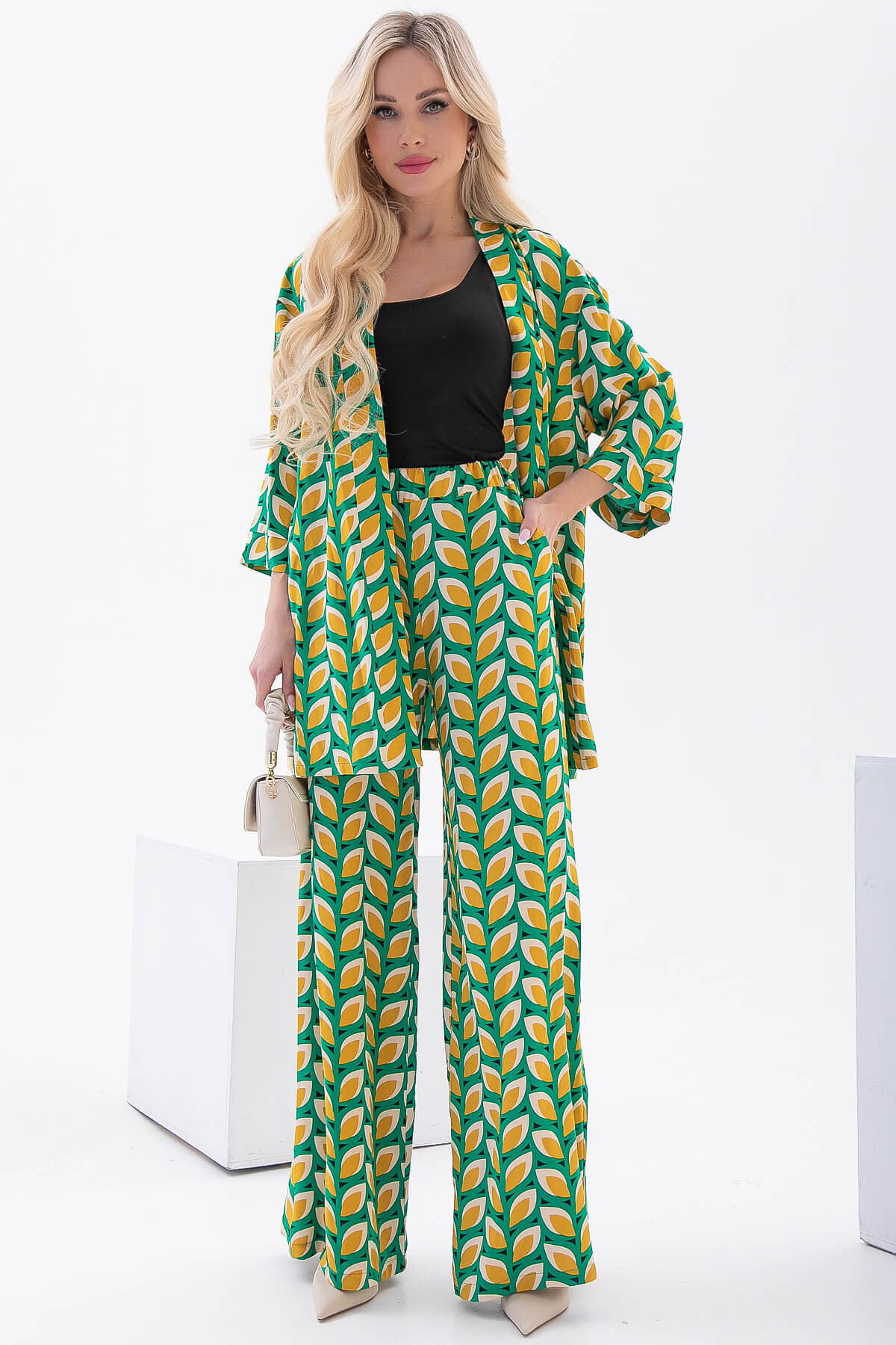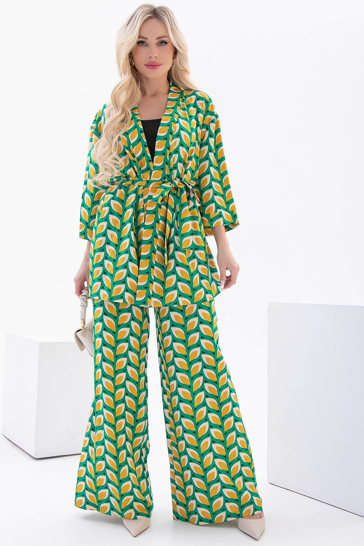 Костюм из лёгкой ткани идеально подойдёт для летнего расслабленного образа. Свободный крой не сковывает движений и дарит комфорт. Рукав укороченный со спущенным плечевым швом.В комплект входит пояс из основной ткани, который позволит подчеркнуть преимущества фигуры.