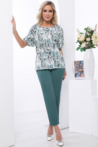 Элегантный костюм, состоящий из брюк с высокой посадкой на резинке и блузы свободного кроя с акцентными рукавами. Очень женственный комплект с милым флористическим принтом. Блуза свободного кроя, округлый вырез горловины, рукав три четверти, втачной, по форме напоминает "фонарик".