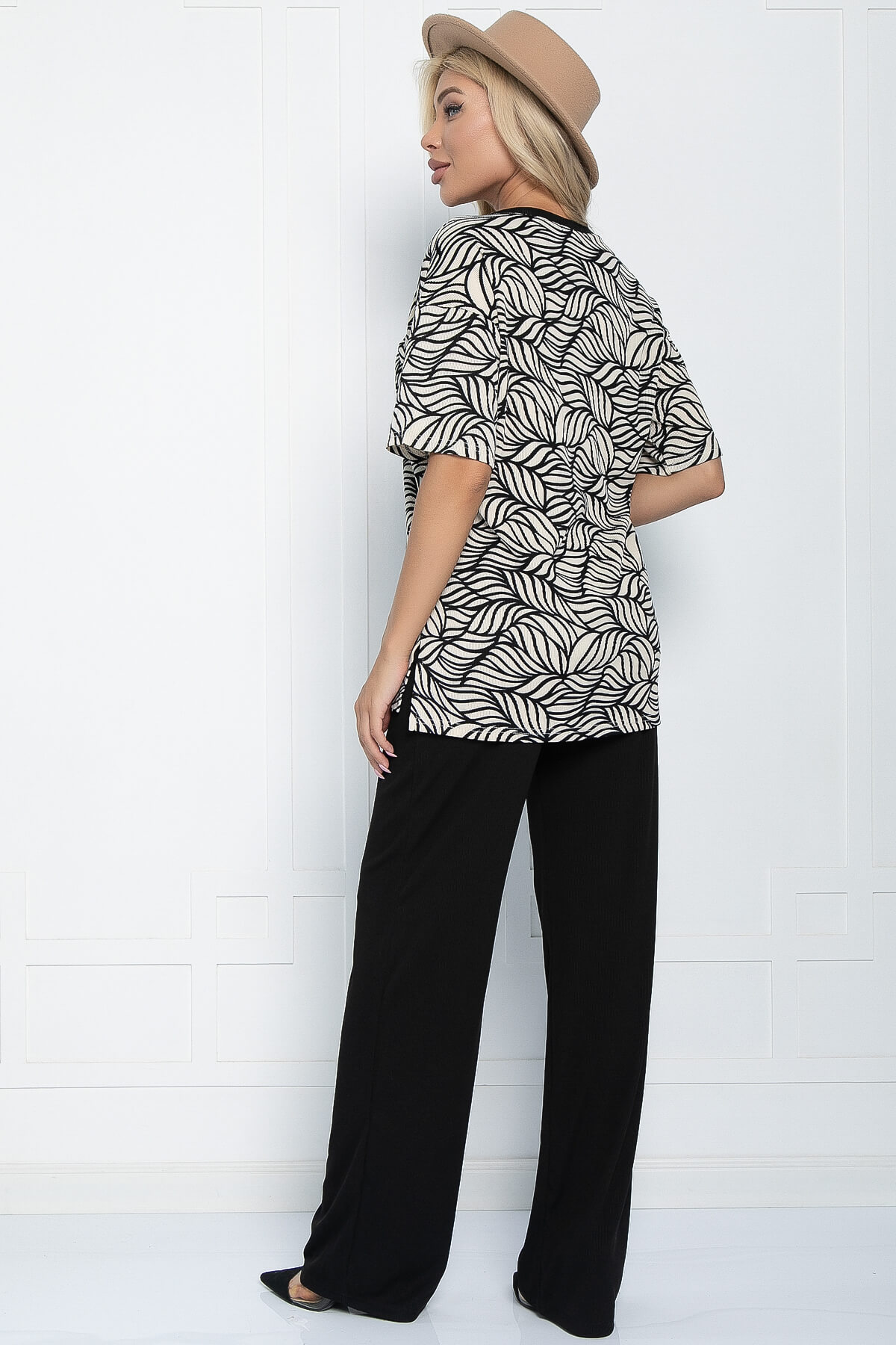 Костюм-двойка, состоящий из прямых брюк с высокой посадкой на резинке и джемпера свободного кроя. Преимущество комплекта в том, что вы сможете самостоятельно носить как джемпер, так и брюки. В повседневном образе смело сочетайте с лоферами или ботинками, а если нужен более официальный образ, с туфлями на каблуке.