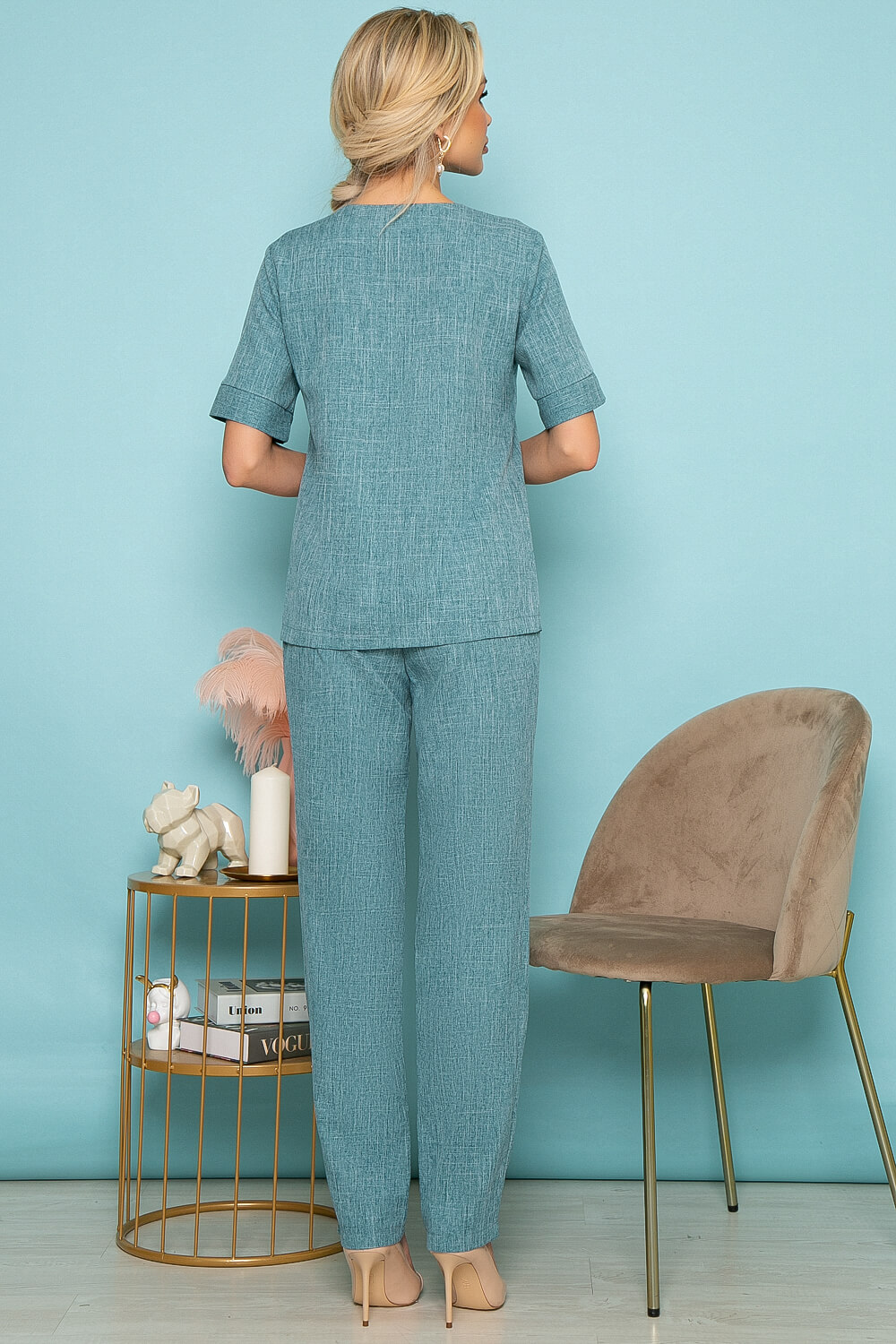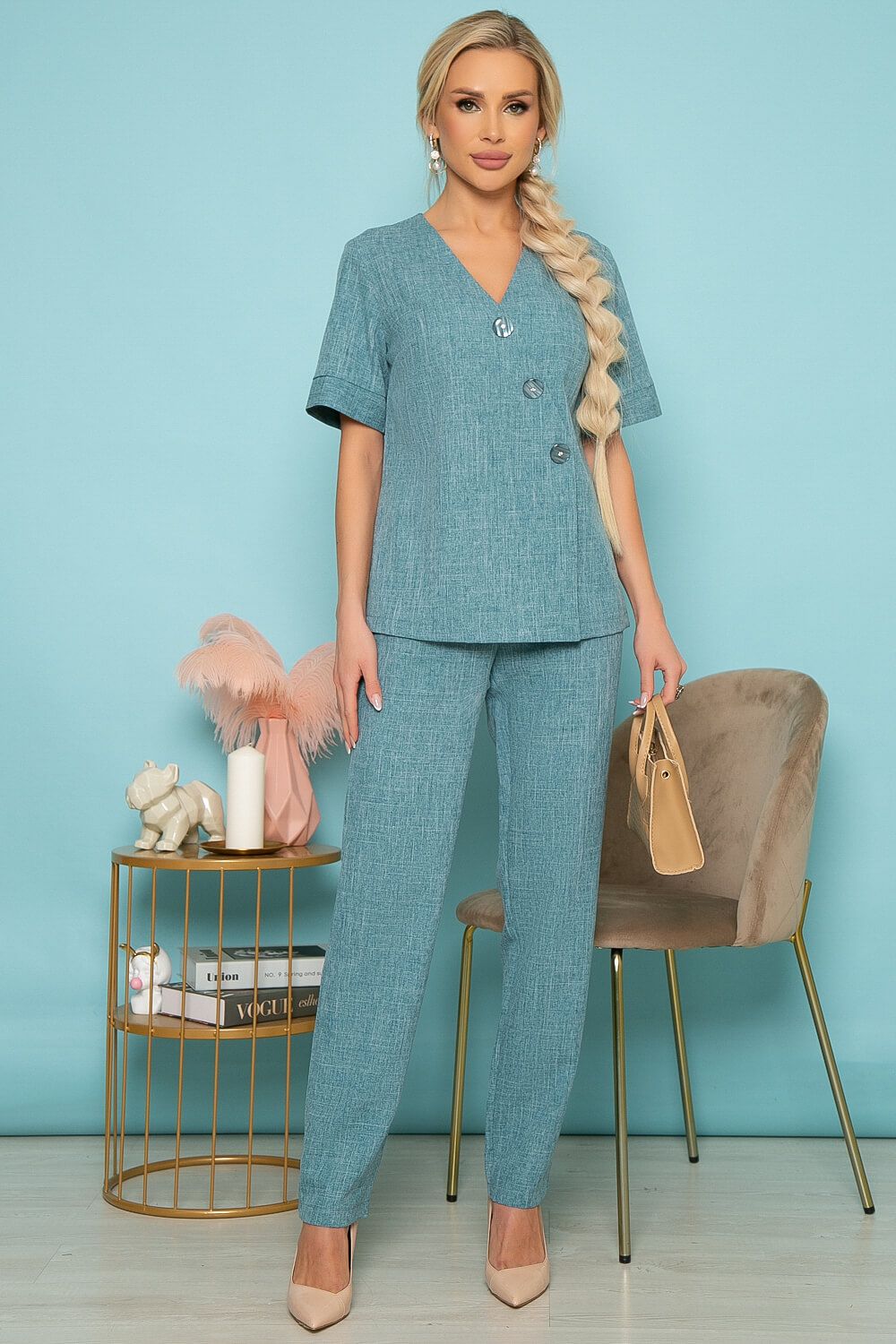 Брючный костюм - идеальная пара в офисном стиле. Блуза свободного кроя по переду украшена декоративными пуговицами в тон. Рукав втачной, короткий. Брюки прямого кроя, талия на резинке.