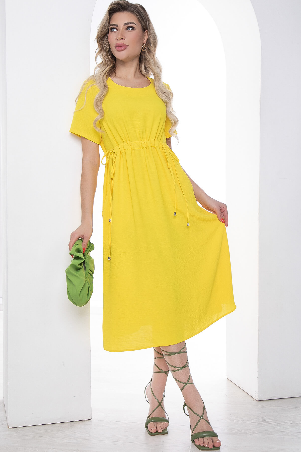 Яркое летнее платье длиной миди — отличный выбор, если вы ищете расслабленный, но в то же время стильный наряд. Желтый цвет даёт интересные комбинации в сочетании с другими оттенками. Изделие с кулиской под грудью, можно завязывать банты. Рукав укороченный, втачной. Спереди есть два потайных кармана.