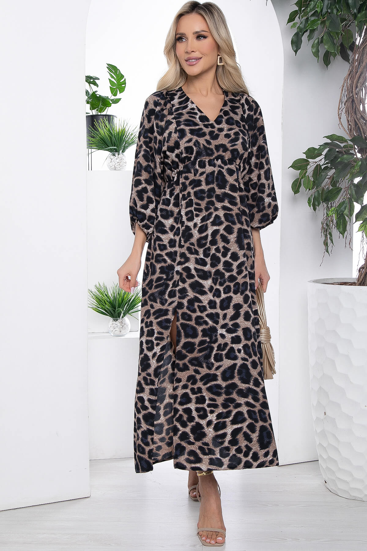 Леопардовый принт — трендовая вещь на пике моды и стиля! Его можно носить на вечерние мероприятия, праздники или на повседневные прогулки по городу. Платье на резинке по талии, рукав 3/4 на резинке, длинный разрез по ноге.