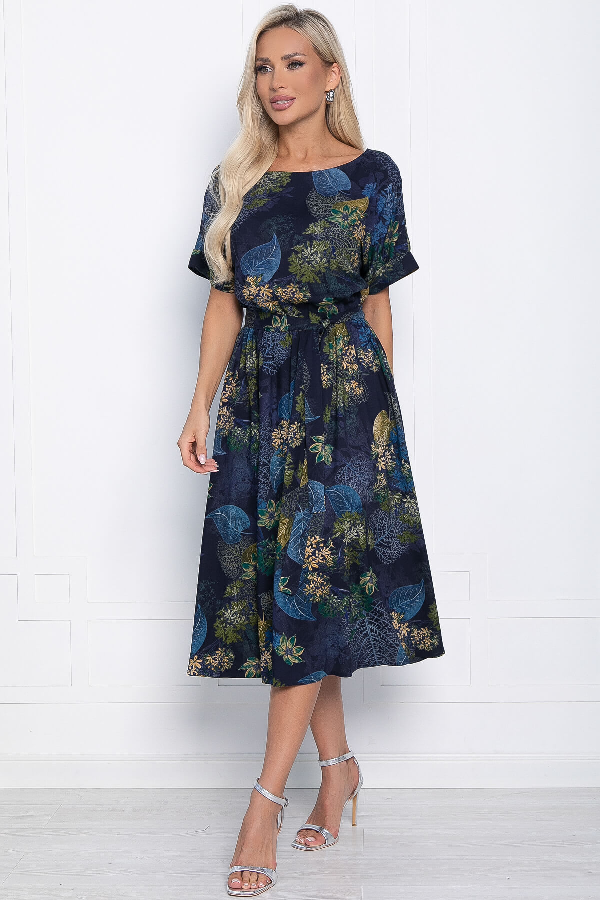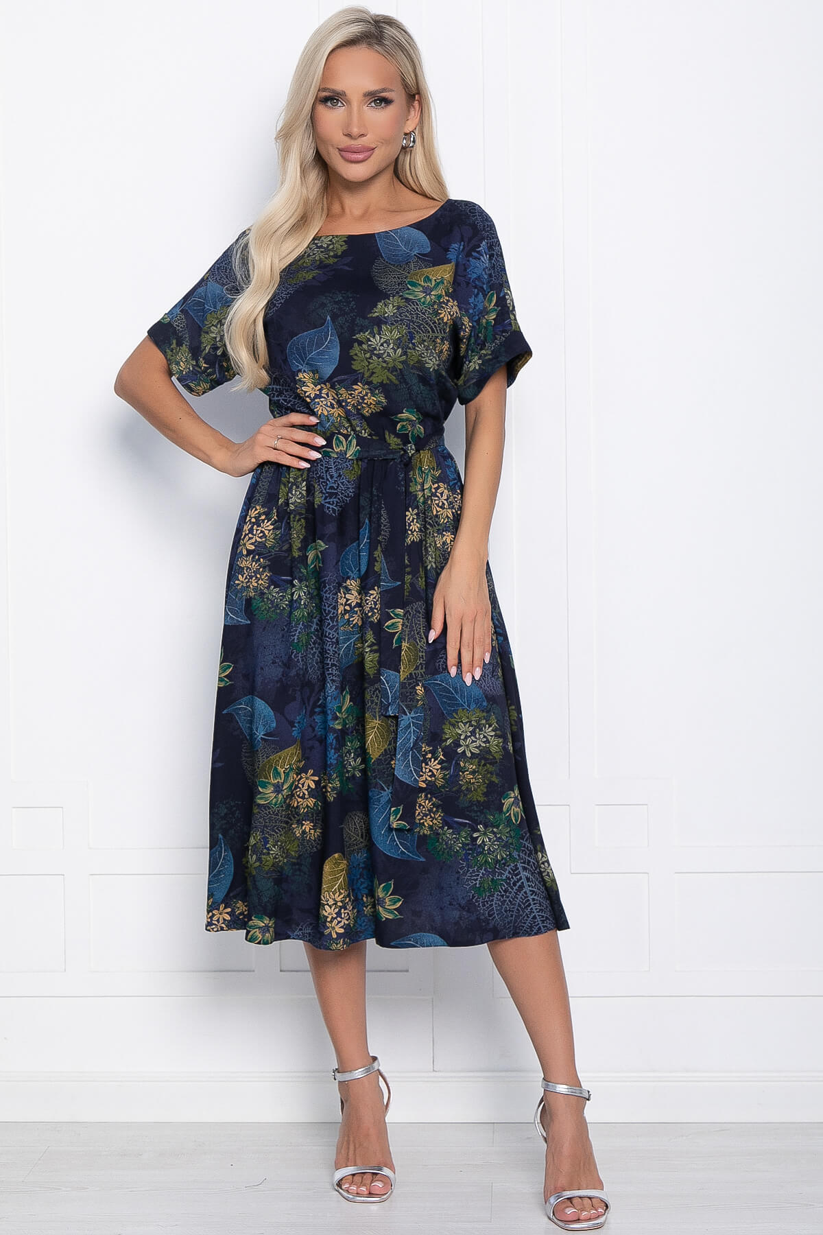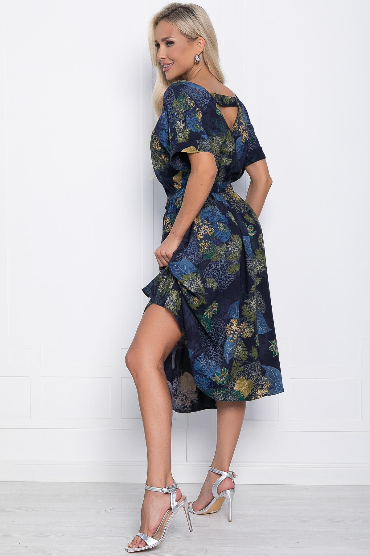 Элегантное, женственное платье с цветным рисунком, талия на резинке, с поясом в комплекте, сзади V - образный вырез с планкой.