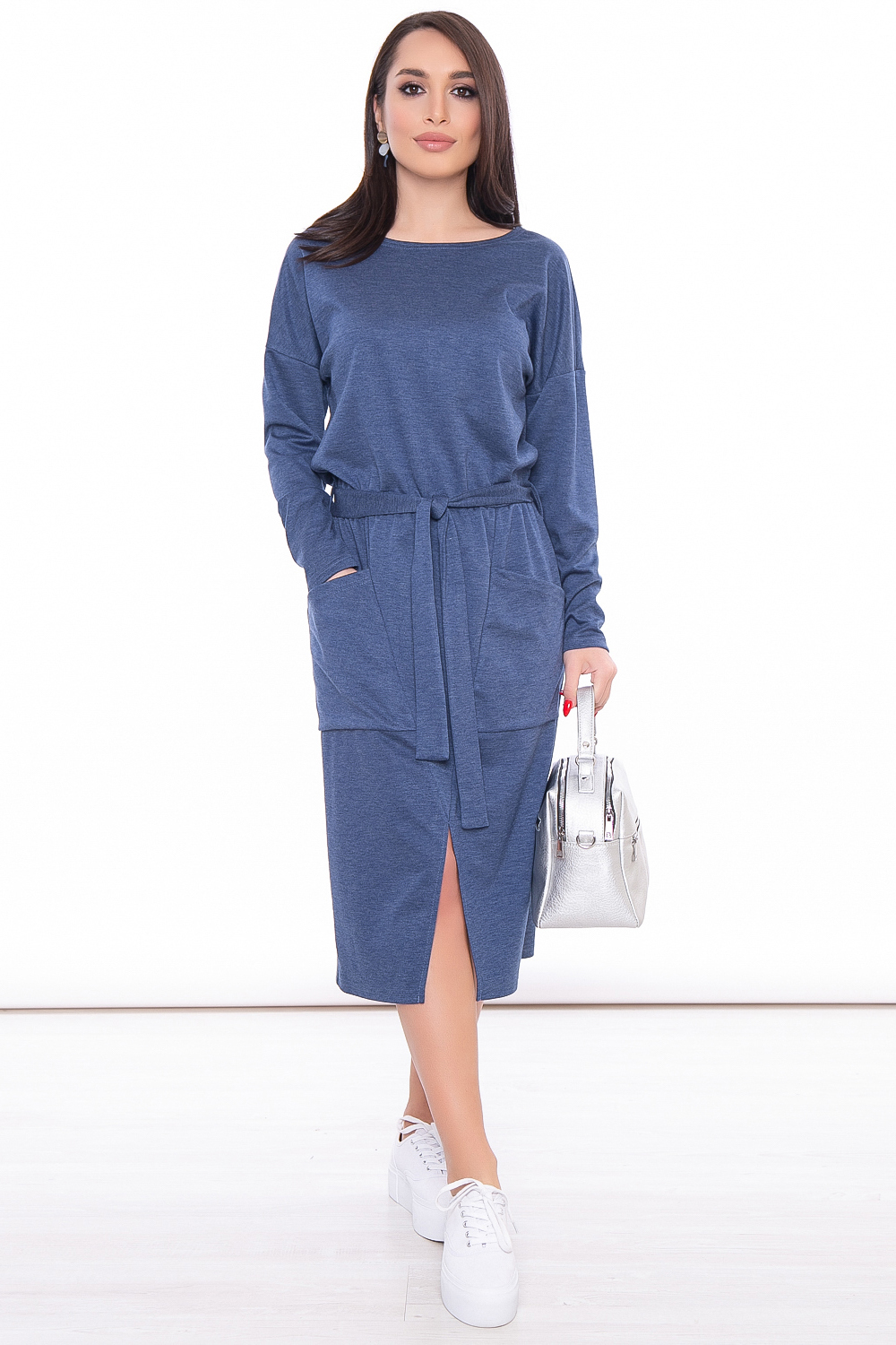 Трикотажное платье средней длины в универсальном оттенке "джинс". Если Вы искали новый необычный повседневный образ, то это платье создано, чтобы стать его частью!