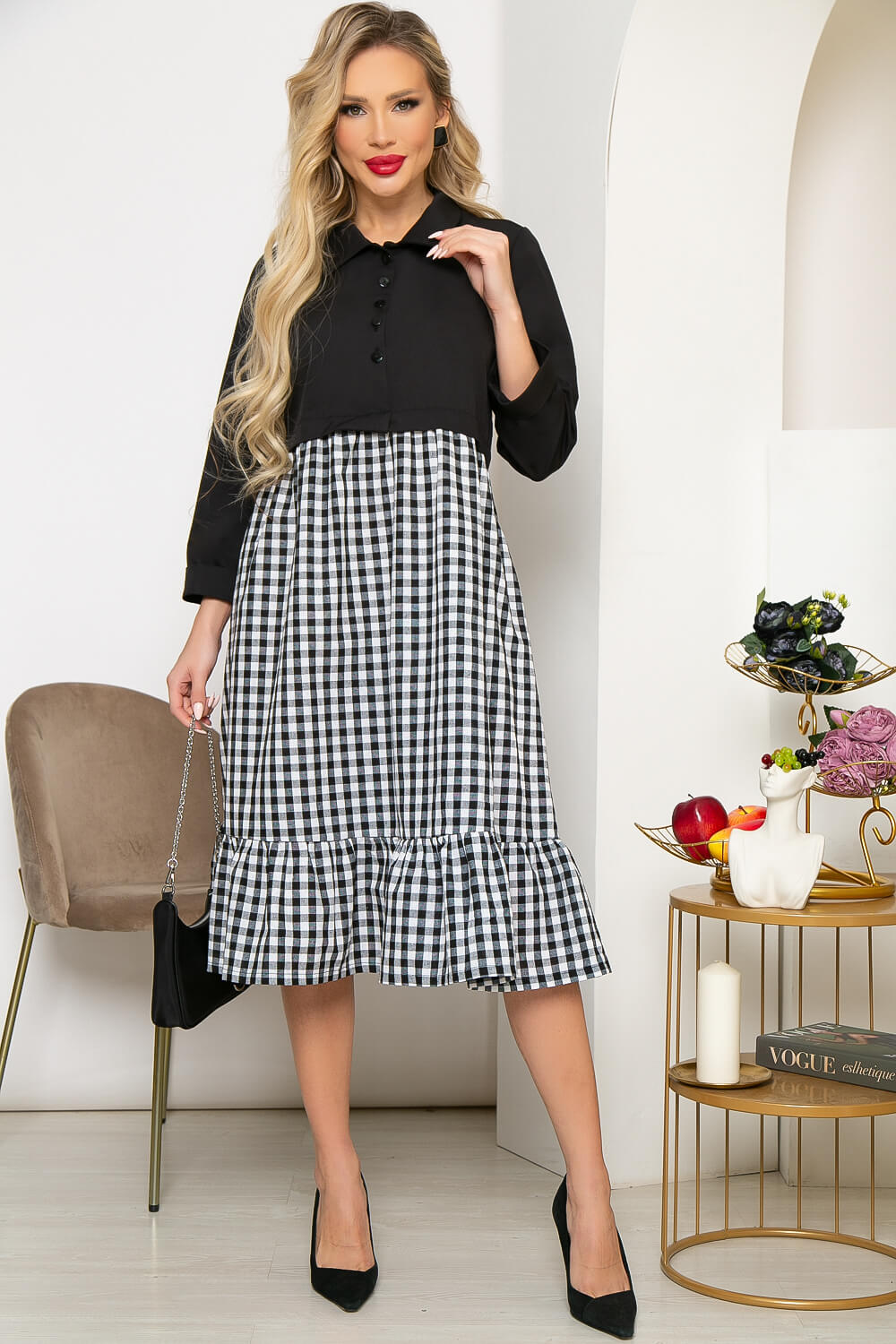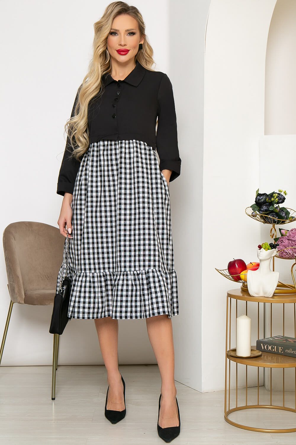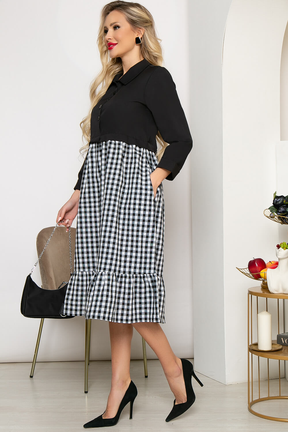 Женственное платье из комбинированной ткани создаст интересный женственный образ. Платье отрезное по линии талии, лиф выполнен из плотной костюмной ткани с пуговицами по переду. Низ лифа оформлен цельнокроеной обтачкой.