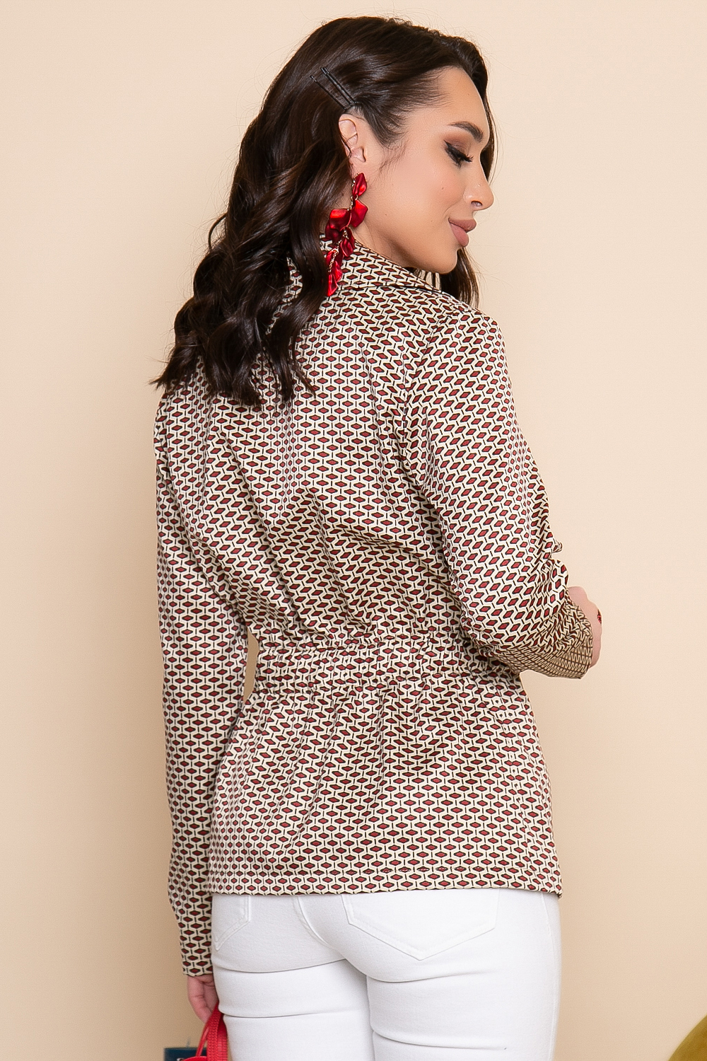 Жакет на каждый день в оригинальном исполнении в базовом бежевом оттенке с принтом. Легко будет сочетаться с Вашим гардеробом и подойдёт в качестве верхнего слоя. Идеальный вариант на весенний период. Жакет полуприлегающего силуэта, двубортный, на кнопках, отложной воротник, рукав втачной, длинный. Английский воротник, на талии создаёт драпировку эластичная резинка. Жакет без подкладки.