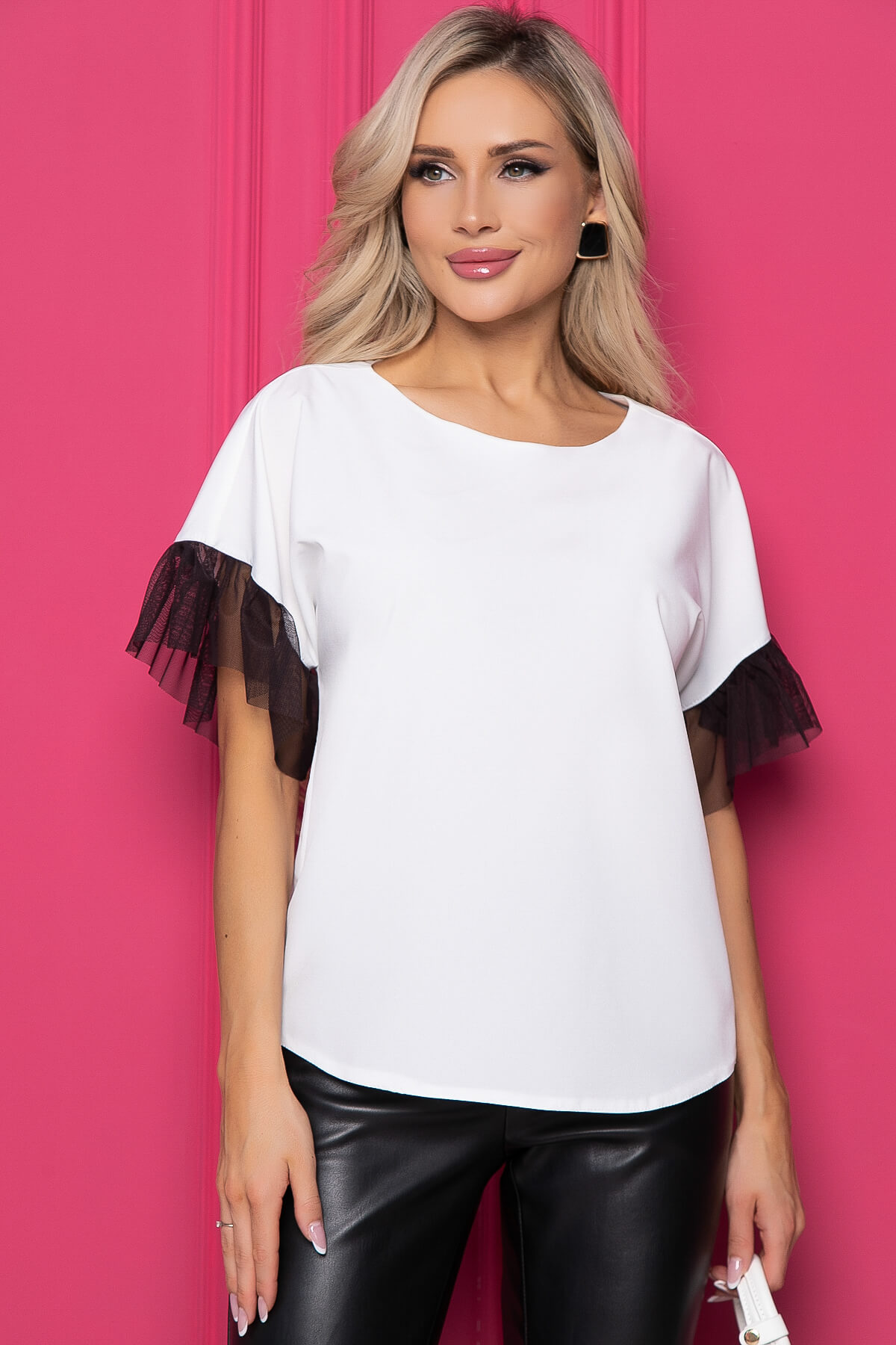 Базовая женская блуза свободного кроя из приятной к телу блузочной ткани. Такая блуза может стать основой не только делового гардероба, но и вечернего наряда. Оригинальный дизайн объединяет в себе классику кроя базовой блузы и трендовый декор в виде присборенной сетки на рукавах. Сетка выполнена в контрастном варианте подходящего подтона основному цвету изделия. Горловина-лодочка комфортного размера без застежки, а укороченный рукав-кимоно позволит чувствовать себя свободно и не будет стеснять вас в движении.