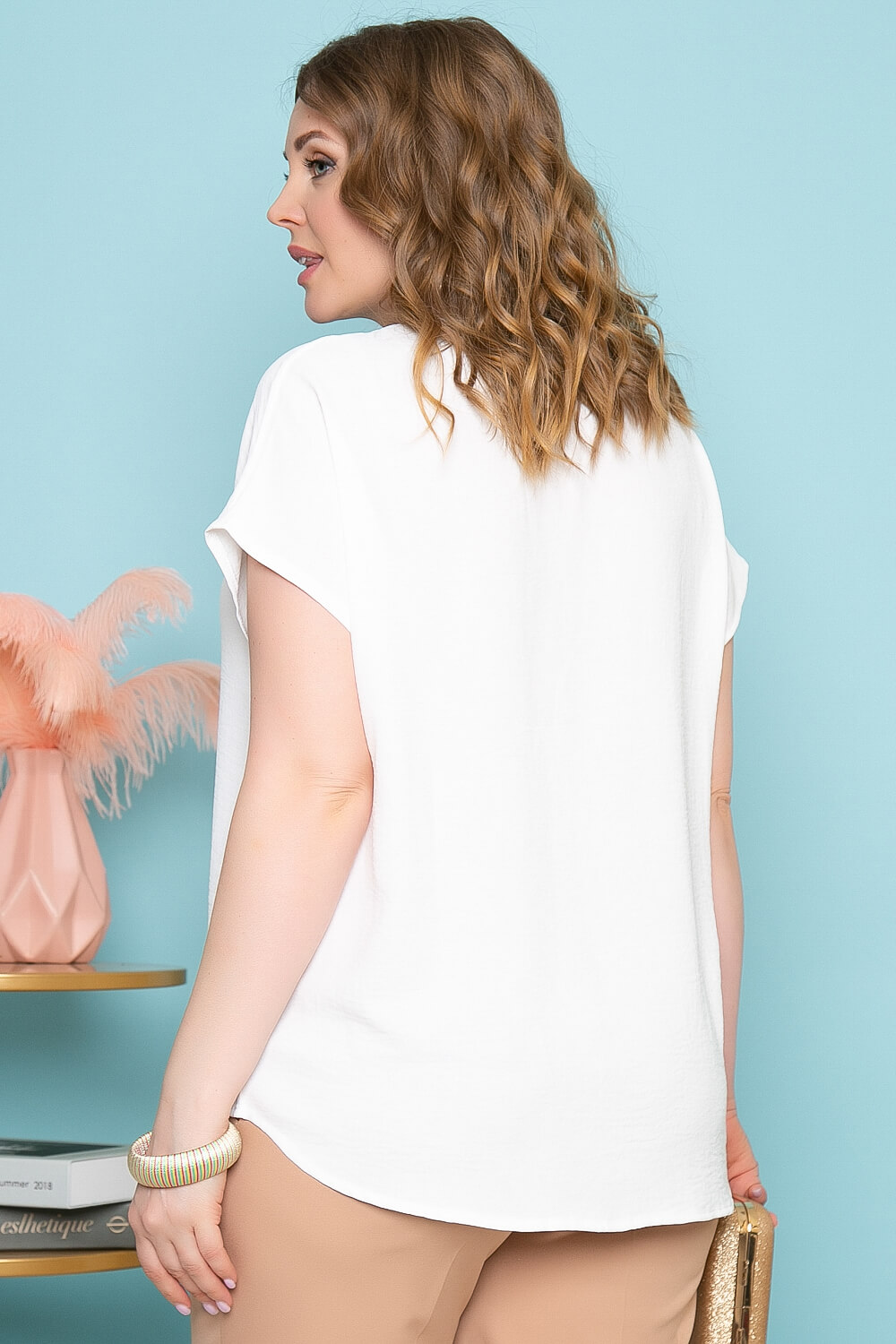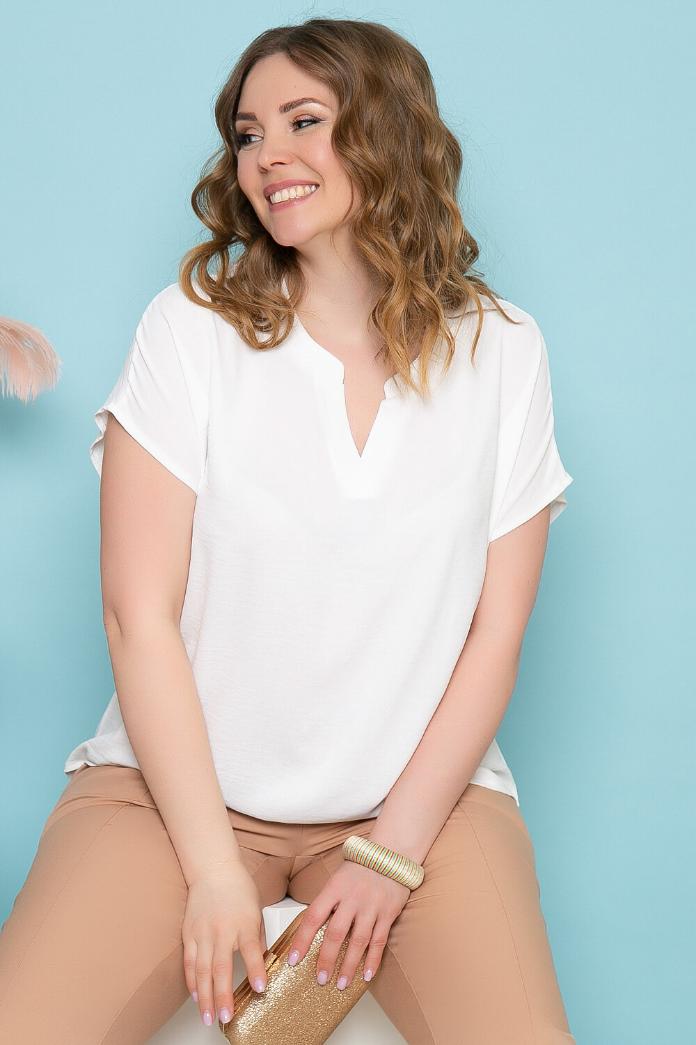 Элегантная лёгкая блуза с коротким рукавом для создания элегантных летних образов. Блуза свободного кроя, рукав цельнокроенный. Мягкий, округлый вырез горловины дополнен V-образным разрезом. Прекрасно будет сочетаться с классическими брюками или юбкой.