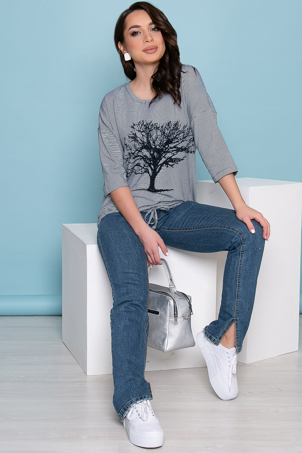 Футболка в мелкую полоску и рисунком в виде дерева, украшенного термо-стразами. Прекрасно сочетается с джинсами, лосинами, брючками. Футболка свободного кроя, рукав втачной, три четверти, плечевой шов спущен. По низу футболки - кулиска.
