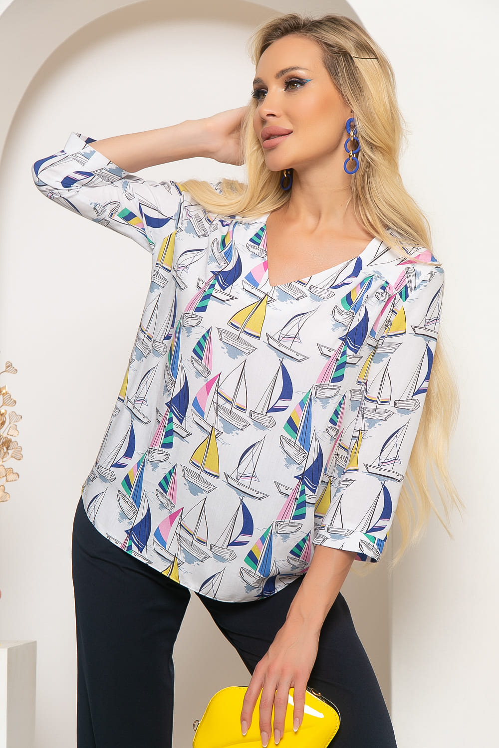 Блуза - основа женского гардероба. Она позволит подчеркнуть женственность и придать элегантность образу. Блуза в белом оттенке с ярким рисунком. Можно носить под заправку, например, с брюками с высокой посадкой или навыпуск. Блуза имеет свободный крой и красивый V-образный вырез горловины. Цельнокроенная кокетка оформлена драпировкой по переду. Рукав втачной, три четверти на манжете.