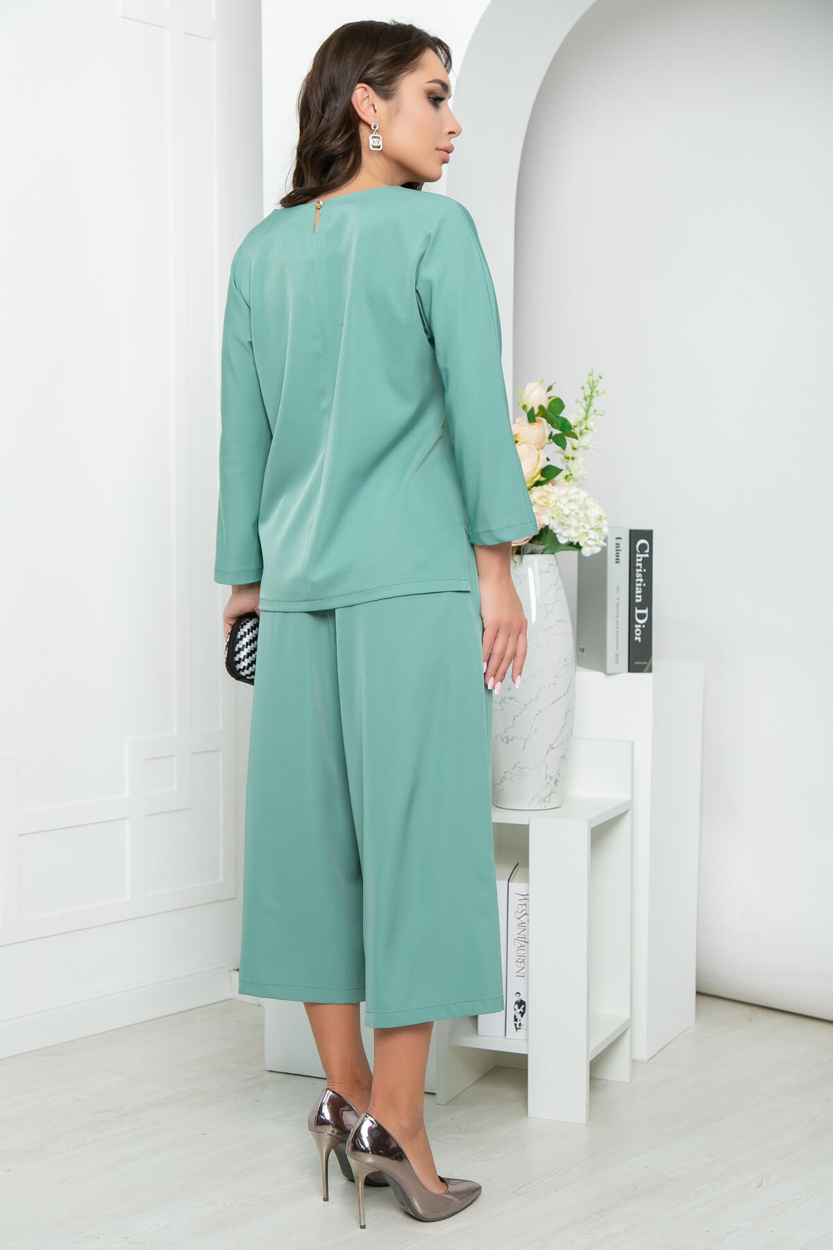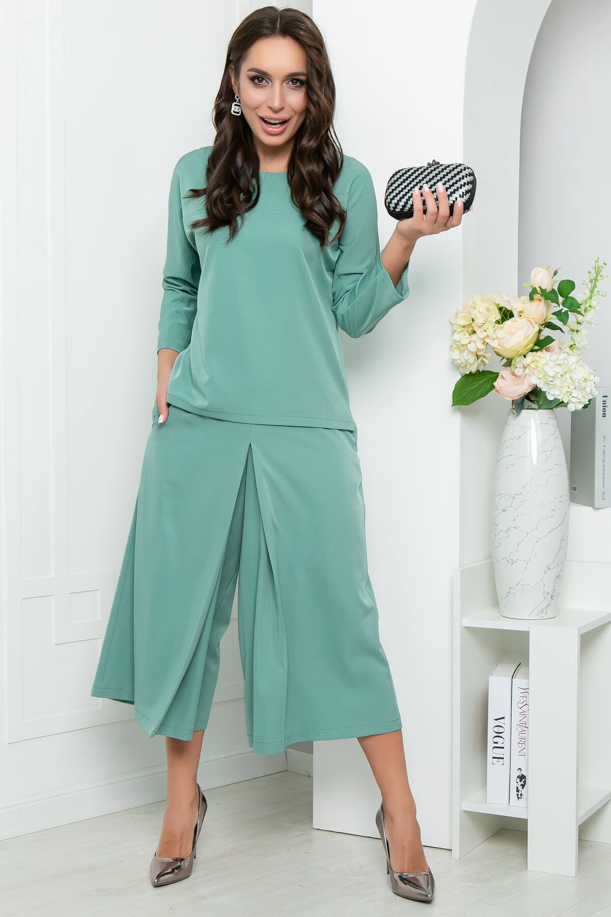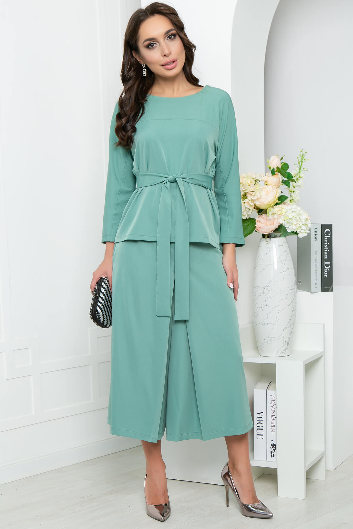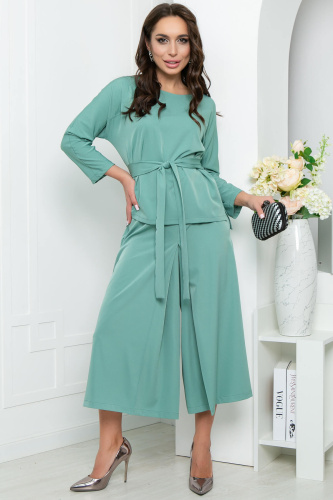Костюм из лёгкой костюмной ткани в красивом мятном оттенке подойдёт для создания повседневного или стильного делового образа. Отдельного внимания заслуживает нижняя часть костюма. Юбка-шорты - эффектная альтернатива брюкам. Свободный крой не сковывает движений и дарит комфорт. В комплект входит пояс из основной ткани.