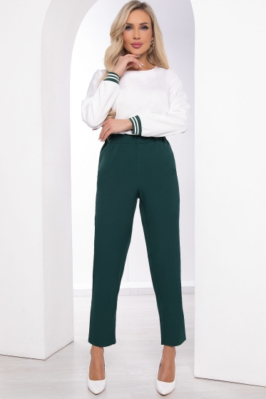 Стильный костюм-двойка, состоящий из зауженных брюк с высокой посадкой на резинке и блузы свободного кроя. Длинные рукава на блузе завершается красивыми эластичными манжетами в полоску. Преимущество комплекта в том, что вы сможете самостоятельно носить как блузу, так и брюки. В повседневном образе смело сочетайте с лоферами или ботинками, а если нужен более официальный образ, с туфлями на каблуке.