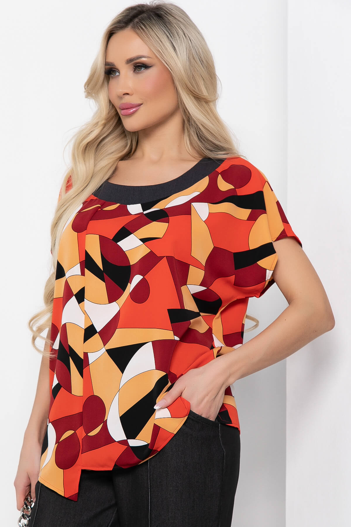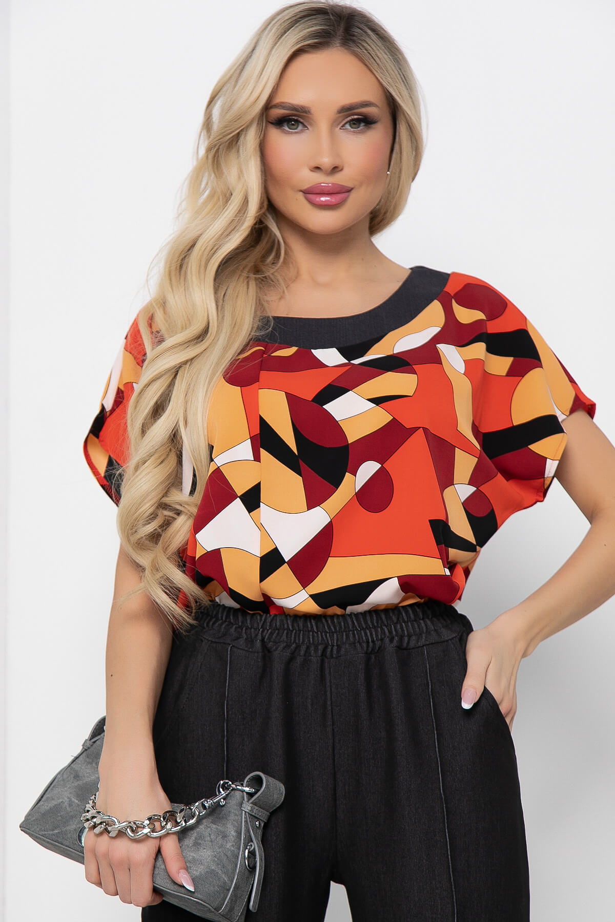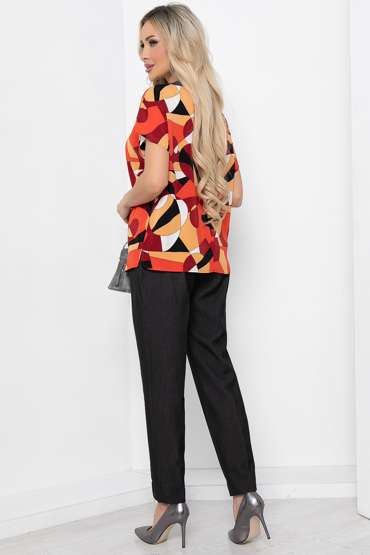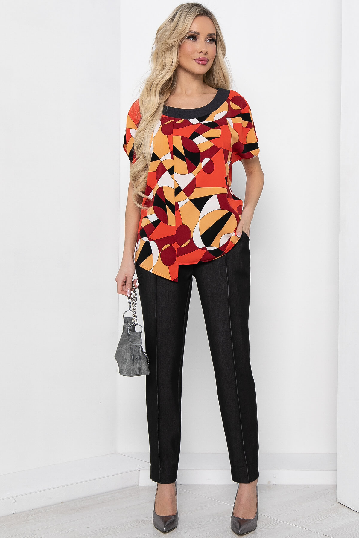 Яркий брючный костюм для создания игривого образа! Брюки классической длины, но можно подвернуть и создать еще более модный образ. Модель брюк со стрелками, талия на резинке, имитация кармашка сзади. В боковых швах брюк карманы. Красочная блуза из легкой ткани свободного силуэта со спущенной линией плеча. Горловина обработана тканью в тон брюк. Блуза имеет ассиметричный низ.