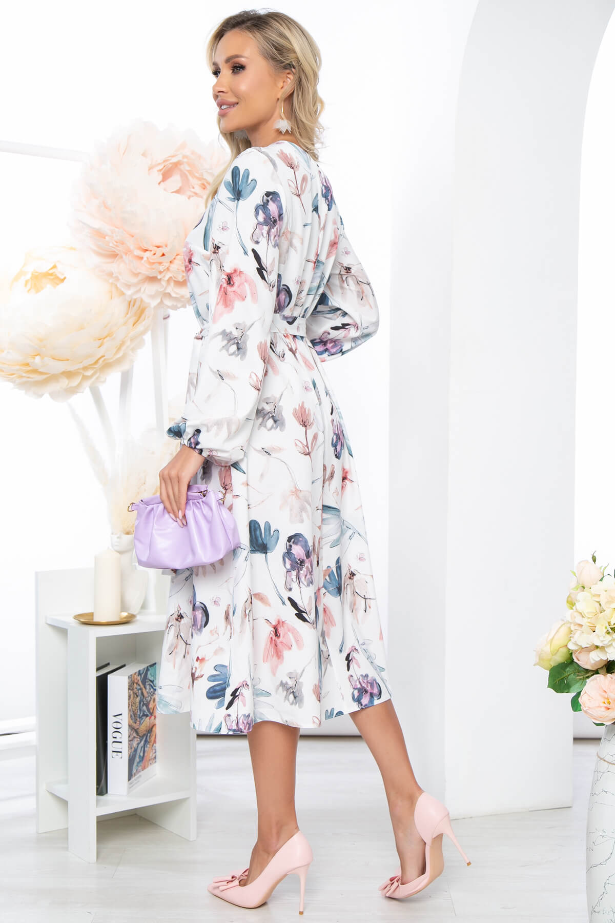 Струящееся платье идеально подчёркивающее Вашу женственность. Платье А-силуэта с красивым V-образный вырезом горловины красиво очертит зону декольте. Красивый пышный рукав на резинке. Пояс из основной ткани входит в комплект. Платье без подкладки.
