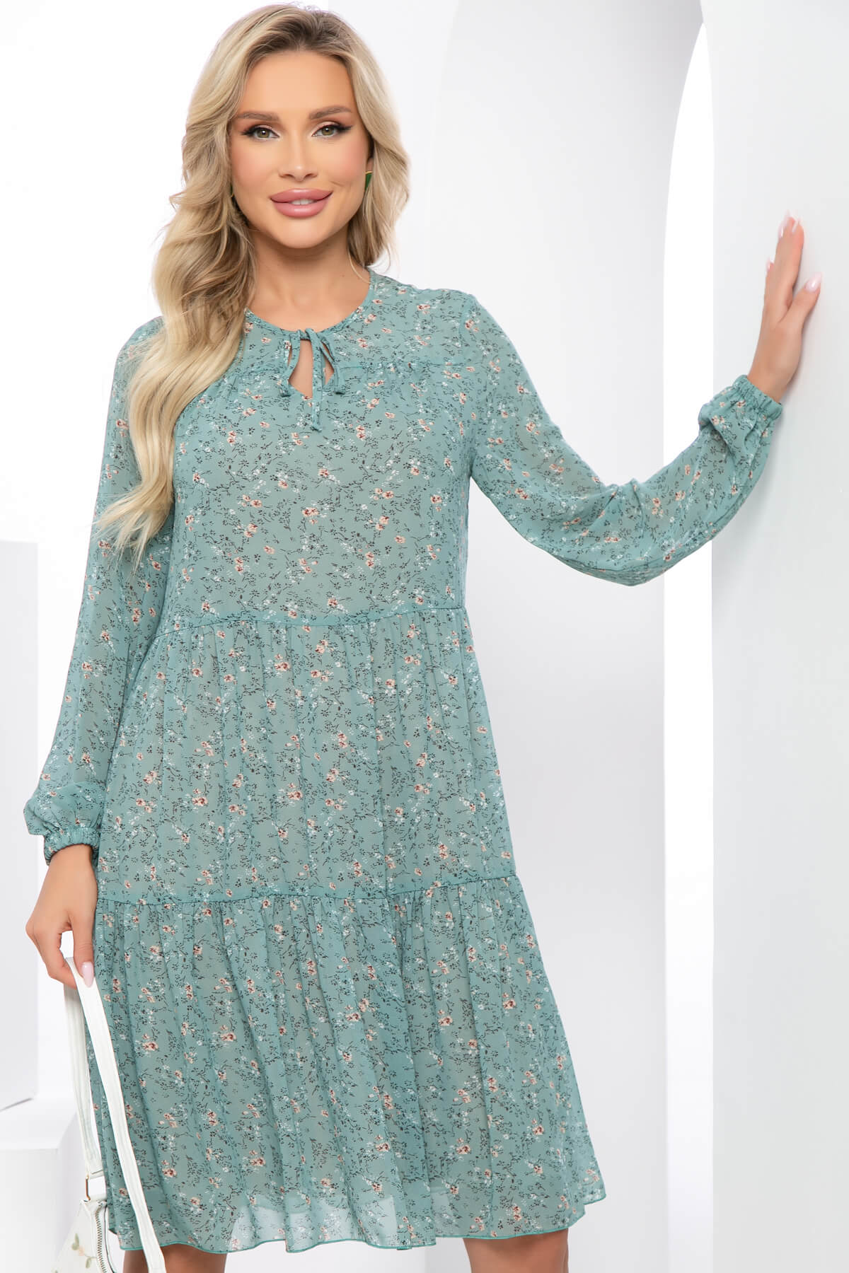 Платье из лёгкой струящейся ткани поможет в создании нарядного образа. Свободный крой платья не будет сковывать движений и позволит чувствовать себя максимально комфортно. Длинный свободный рукав добавит образу лёгкость и придаст женственности.