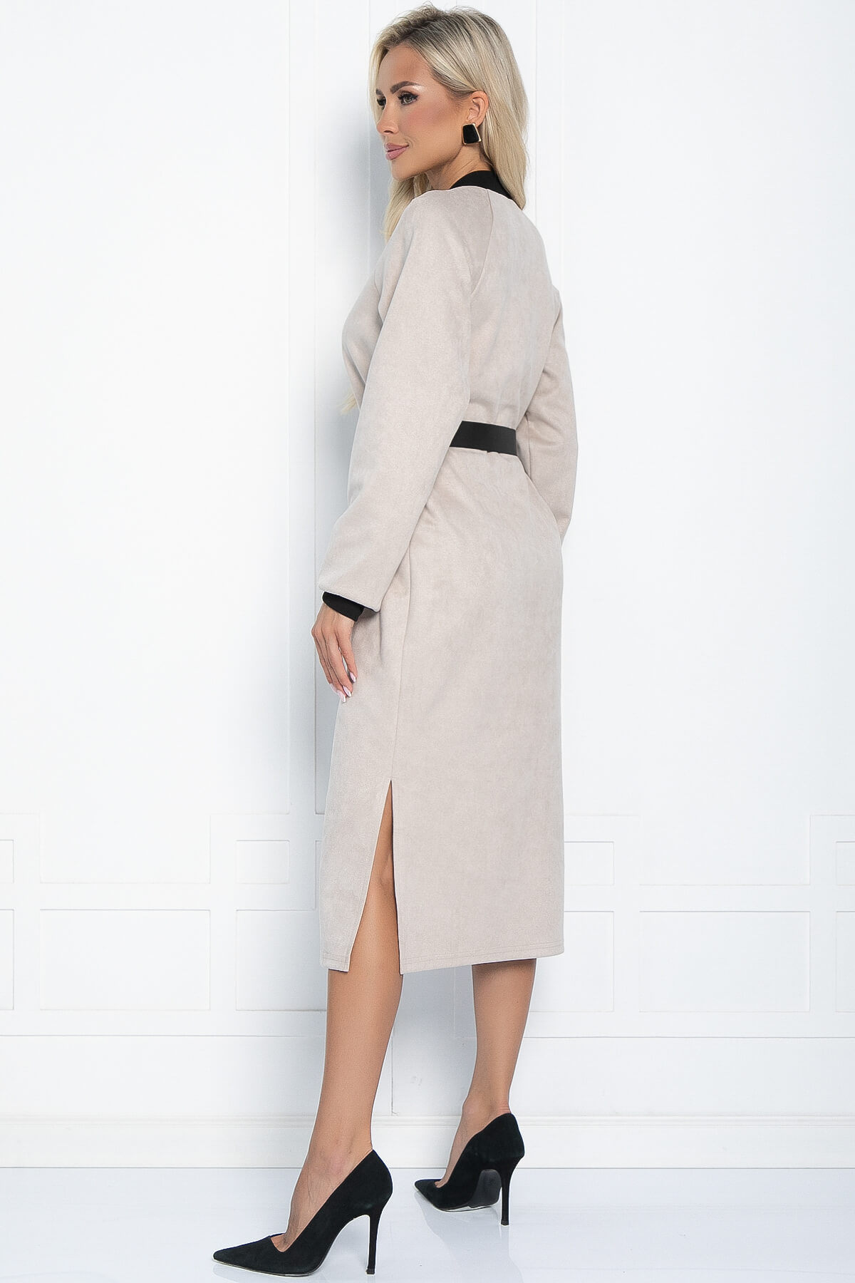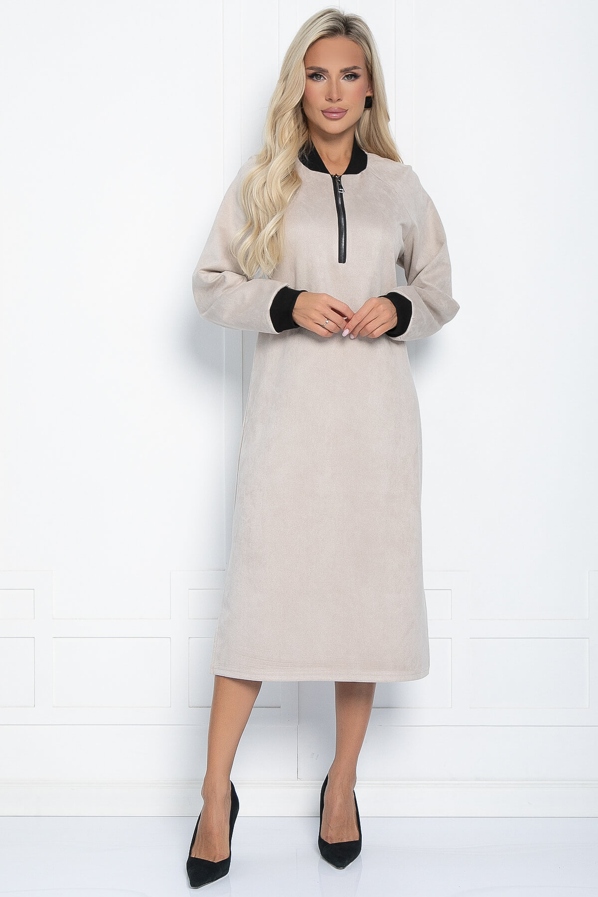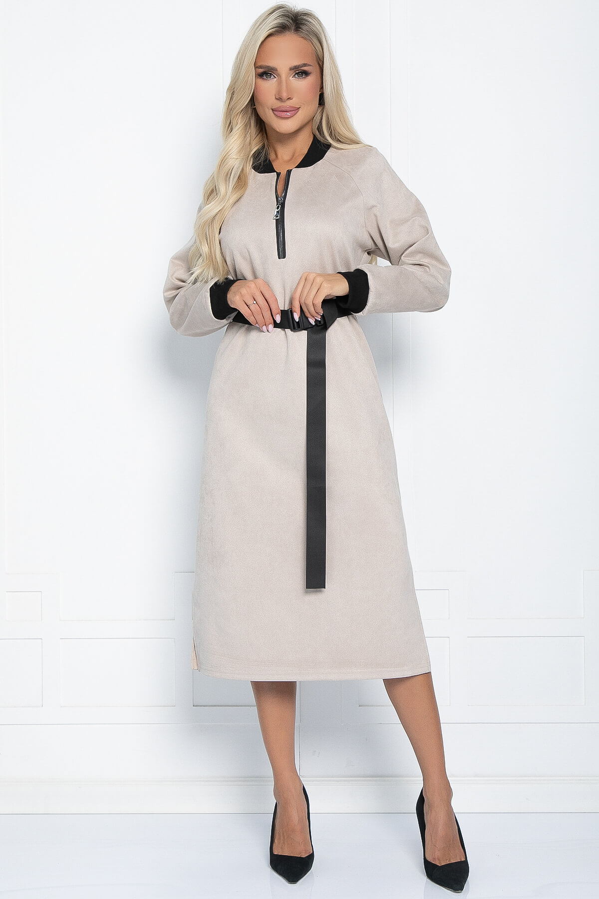 Стильное платье прямого силуэта невероятно приятое на ощупь. Рукав реглан оканчивается притачной манжетой. Воротник выполнен из эластичной трикотажной резинки - кашкорсе. По переду застёгивается на молнию. Низ ровный по бокам разрезы. При помощи пояса, входящего в комплект, можно подчеркнуть талию.