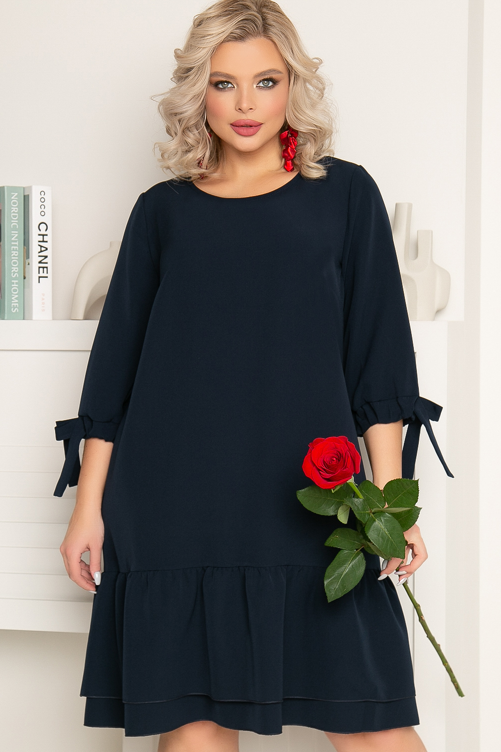 Платье для создания эффектного образа. Платье с колыхающимся от каждого движения воланом - в нем вы будете выглядеть романтично, женственно, к тому же такая деталь может скрыть недостатки фигуры! Красивое воздушное платье в благородном синем оттенке прекрасно дополнит Вашу повседневную капсулу. Крой платья свободный, мягкий округлый вырез горловины, красиво подчеркивает шею и приоткрывает зону ключиц. Юбка с широким, двойным воланом добавляет романтичности образу. Рукав втачной три четверти на резинке, декорирован милым бантиком из основной ткани. Спинка разрезная, платье без замков и подкладки.