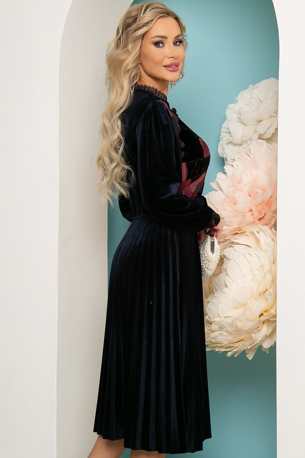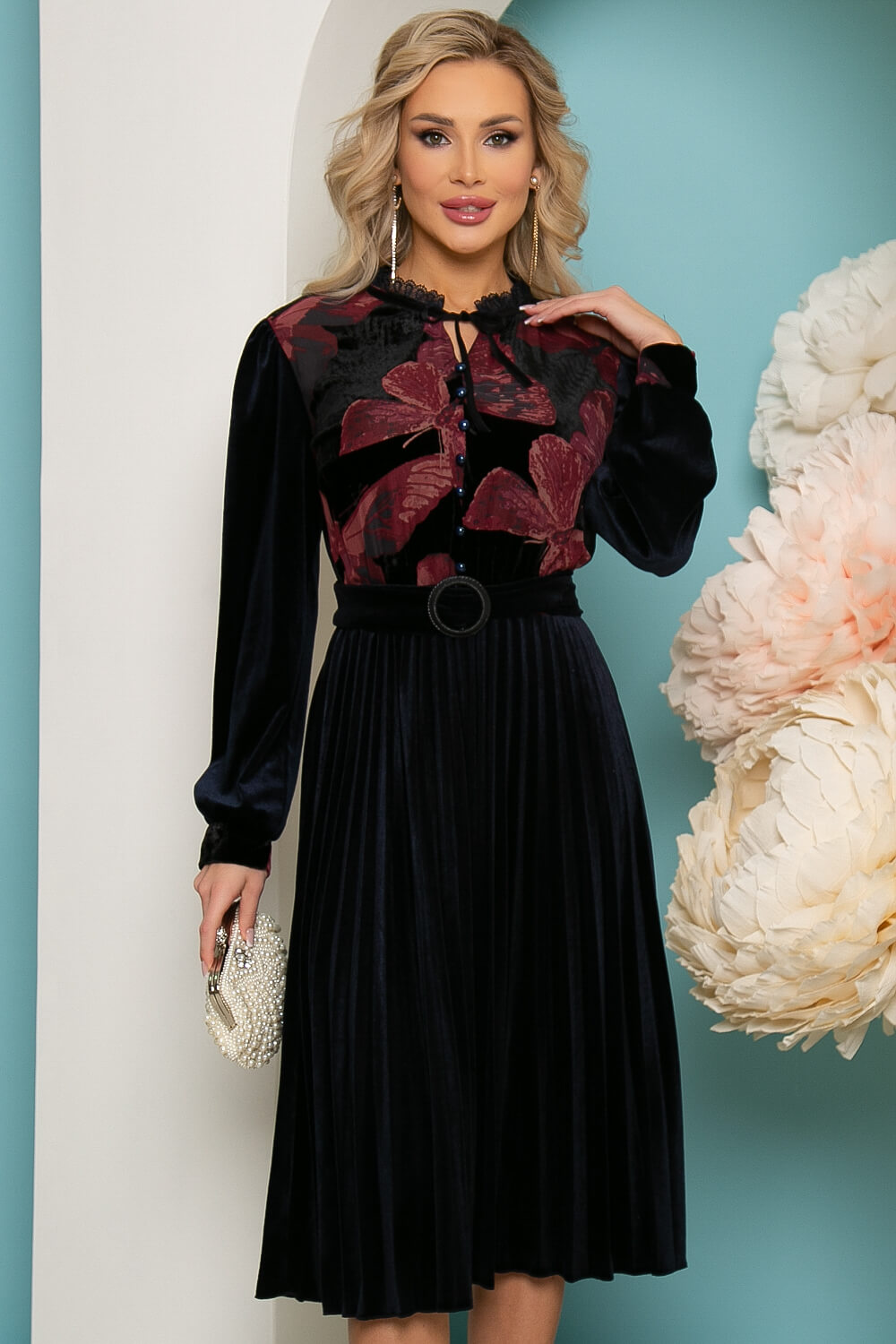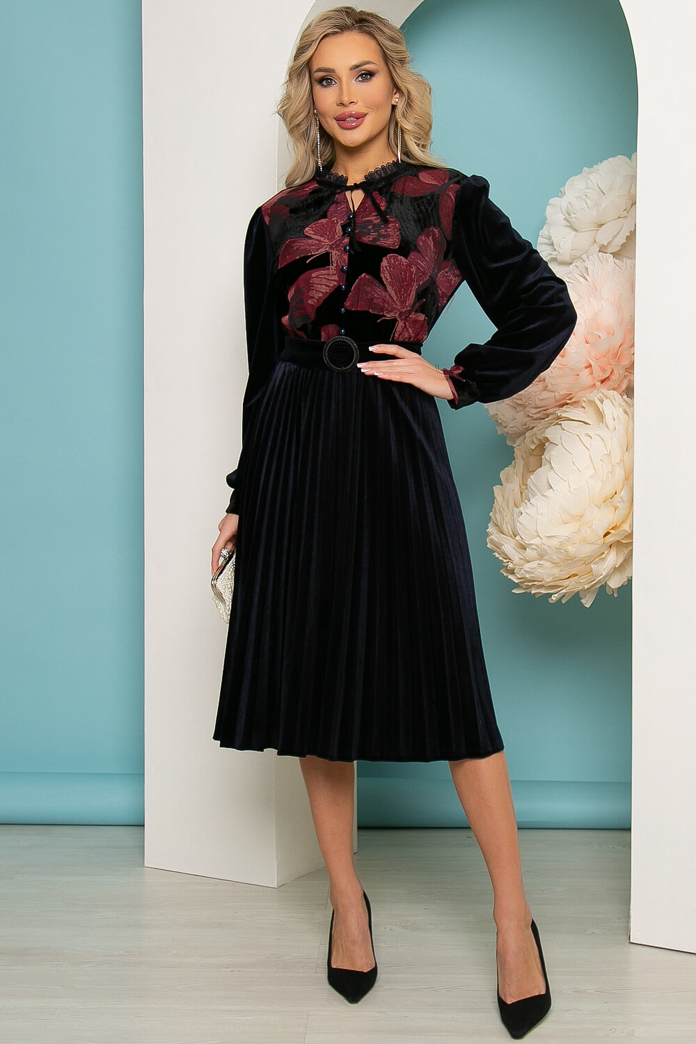 Платье с плиссированной юбкой из бархата в красивом чернильно-синем оттенке. Талья отрезная, рукав длинный на манжете. Красивый воротничок оформлен кружевной стойкой и оформлен бархатной лентой, которая оформляет бантик на вырезе. Передняя часть верха скроена из комбинированного материала с цветочным принтом, украшена пуговками. В комплекте бархатный пояс с круглой пряжкой, подчёркивающий талию.